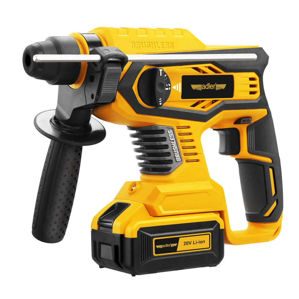 Akumulatorowa młoto-wiertarka AKU-1400W - czterokrotnie większa żywotność i dwukrotnie większa wydajność. Silnik bezszczotkowy młoto-wiertarki AKU-1400W zapewnia do 25% większy moment obrotowy, niż w silniku szczotkowym. W AKU-1400W energia pojedynczego uderzenia udaru wynosi aż 2,2J. Narzędzie wyposażone jest w latarkę LED, ergonomiczną, dobrze wyprofilowaną rękojeść, dodatkową, regulowaną rękojeść przednią oraz ogranicznik głębokości wiercenia. Posiada 3 stopniową regulację siły momentu obrotowego oraz 4 funkcje: wiercenie, wiercenie z udarem, podkuwanie, obracanie dłuta. Wszystkie akumulatorowe narzędzia ADLER współpracują z jednym systemem akumulatorów Li-ion 20V ze wskaźnikiem naładowania.