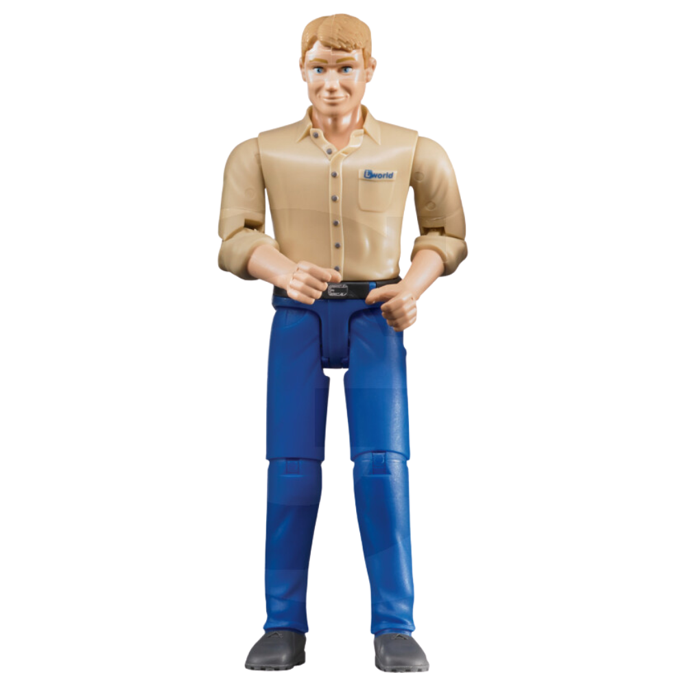 Figurka mężczyzny Bruder 60006 w niebieskich spodniach. Ruchome ręce, nogi i głowa, kompatybilna z pojazdami i zestawami Bruder. Idealna do kreatywnej zabawy i rozwijania wyobraźni.
