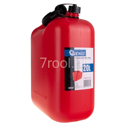 Praktyczny kanister plastykowy 20L z lejkiem. Odporny na paliwa, oleje i wodę. Wykonany z HDPE, posiada atest do substancji niebezpiecznych.