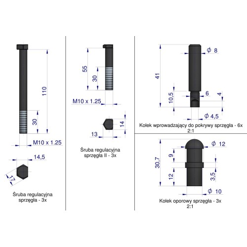 Zestaw zawiera wszystkie kluczowe elementy odpowiedzialne za prawidłową pracę łap sprzęgła oraz mechanizmu wyłączającego. Wkładki oporowe i kamienie sprzęgła zapewniają równomierne przenoszenie nacisku. Kołki oporowe, wyłączające oraz wprowadzające stabilizują pracę mechanizmu i eliminują nadmierne luzy. Śruby regulacyjne wraz z nakrętkami umożliwiają dokładne ustawienie sprzęgła I i II stopnia, co ma kluczowe znaczenie dla prawidłowej pracy napędu głównego i WOM.
