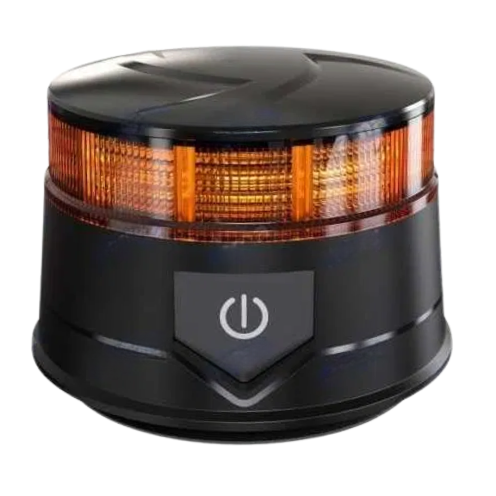 Akumulatorowa lampa ostrzegawcza LED 12–24V z mocowaniem magnetycznym. 7 trybów świecenia, czas pracy do 6,5 godziny. W zestawie ładowarki (sieciowa i zapalniczka). Klasa IP67. Do maszyn rolniczych, budowlanych i serwisowych.