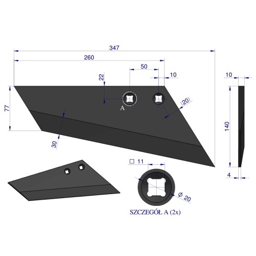 Lemiesz agregatu podorywkowego prawy Farmet Waryński W-3001161 ze stali borowej. Wytrzymała część robocza 347 mm, grubość 10 mm, rozstaw otworów 50 mm – wysoka odporność na ścieranie.