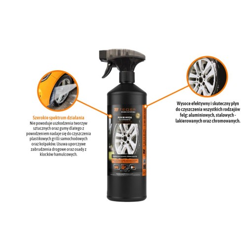 Płyn do mycia felg TEGER to wysoce efektywny preparat przeznaczony do czyszczenia felg aluminiowych, stalowych (lakierowanych) oraz chromowanych. Skutecznie usuwa uporczywe zabrudzenia drogowe i osady z klocków hamulcowych, jednocześnie będąc bezpiecznym dla gum, uszczelek i tworzyw sztucznych.