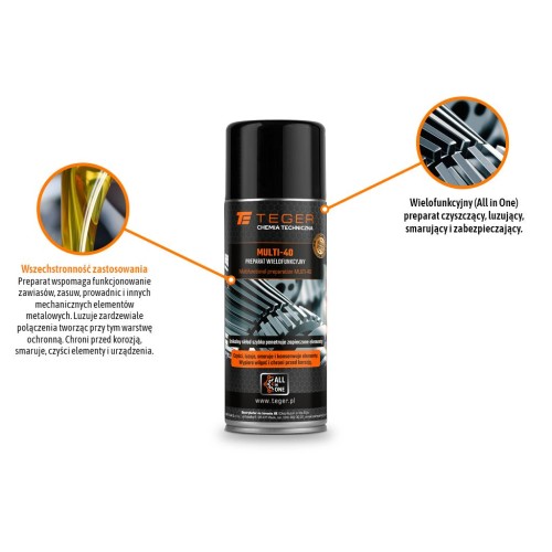 Preparat MULTI-40 400ml / TEGER to wielofunkcyjny środek czyszczący, luzujący, smarujący i zabezpieczający elementy metalowe przed korozją. Doskonale sprawdza się w konserwacji zawiasów, zasuw, prowadnic, śrub, nakrętek, łańcuchów, zamków, świec zapłonowych, maszyn do szycia, narzędzi, broni i wielu innych mechanicznych elementów.