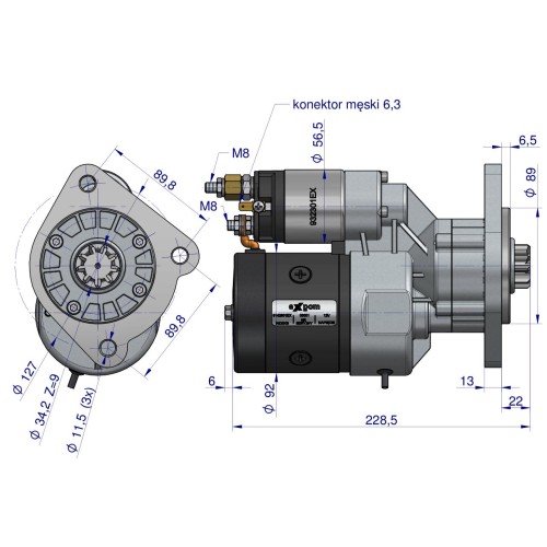 Rozrusznik z reduktorem 9142801EX Blue Line EXPOM KWIDZYN to profesjonalny, szybkoobrotowy rozrusznik typu Magneton przeznaczony do ciągników rolniczych marek New Holland, Ford, Fiat oraz David Brown. Dzięki zastosowaniu przekładni planetarnej zapewnia wysoki moment obrotowy przy niższym poborze prądu, co gwarantuje szybki i niezawodny rozruch silnika – również w niskich temperaturach i przy dużym obciążeniu.