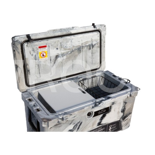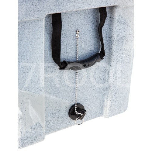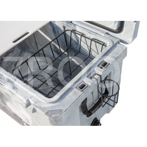 Metalowy koszyk pozwala oddzielić delikatniejsze produkty od lodu lub cięższego ładunku. Szczelny korek spustowy umożliwia szybkie opróżnianie skrzyni z wody po roztopionym lodzie.