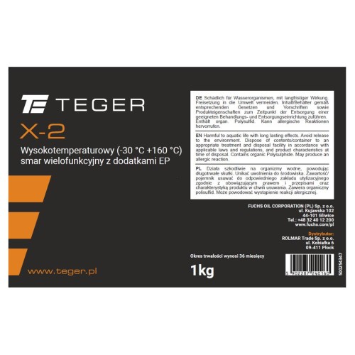 Smar TEGER X-2 1 kg to wysokotemperaturowy smar wielofunkcyjny na bazie mydła kompleksowego litowego, produkowany specjalnie dla TEGER przez firmę FUCHS. Przeznaczony do długotrwałego smarowania w warunkach wysokich obciążeń i temperatur. Charakteryzuje się odpornością termiczną, przeciwstarzeniową oraz stabilnością mechaniczną, zapewniając skuteczną ochronę przed korozją i zużyciem ciernym.