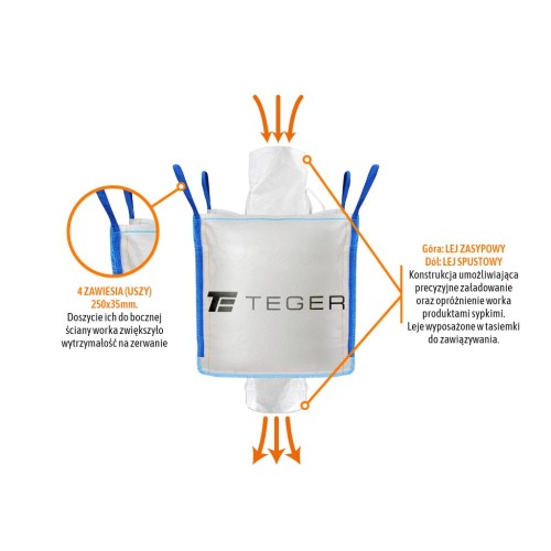 Worek BIG BAG 500 kg TEGER – 90 x 90 x 90 cm, 4 uchwyty, lej zasypowy i spustowy