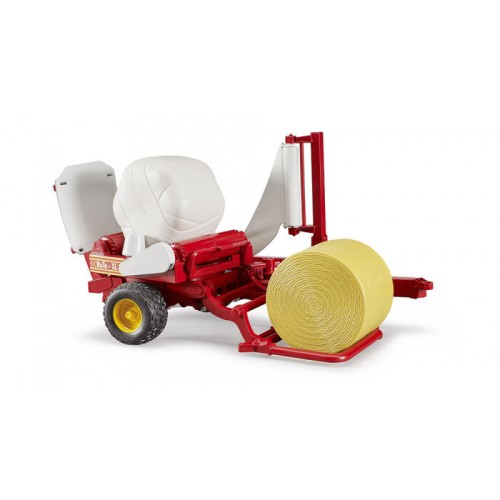 Owijarka do bel Bruder 2122 w skali 1:16 z odchylanym talerzem obrotowym, wahaczem ładującym i regulowanym dyszlem. W zestawie jedna czarna i jedna żółta bela. Kompatybilna ze wszystkimi ciągnikami serii Profi i prasami do bel okrągłych.