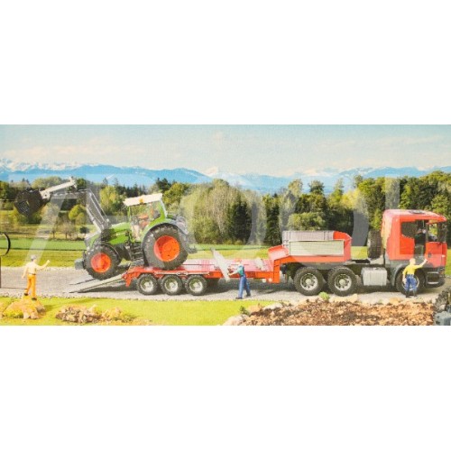Model wykonany jest w skali 1:16 z wytrzymałego tworzywa ABS. Rozsuwany dach umożliwia wygodne sterowanie osią skrętną, a wysokoprofilowe opony zapewniają komfort jazdy po różnych nawierzchniach. Dołączony ładowacz czołowy pozwala na realistyczne nabieranie materiałów, a przyczepa z wywrotką daje możliwość ich transportu i rozładunku dzięki trzem składanym burtom i stabilnej podporze.