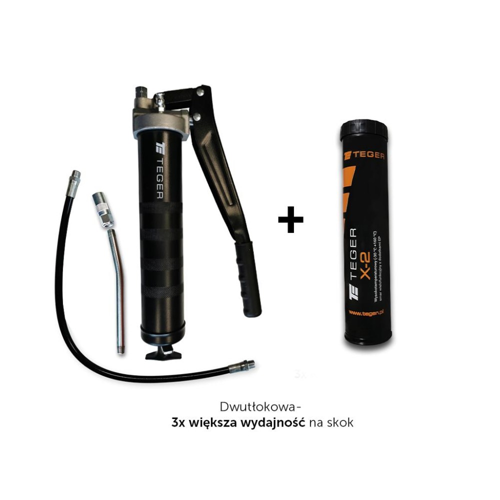 Zestaw TEGER – ręczna dwutłokowa smarownica z wysokotemperaturowym smarem TEGER X-2 400 g. Profesjonalne narzędzie do smarowania łożysk i mechanizmów w maszynach rolniczych, budowlanych i motoryzacyjnych.