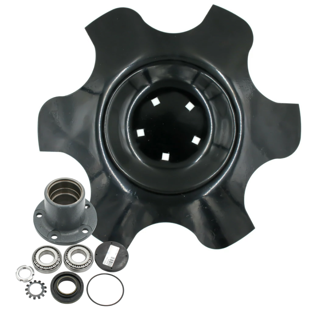 W skład zestawu wchodzi również kompletna, fabrycznie złożona piasta z pełnym zestawem łożysk, uszczelnień i pokrywką. Rozstaw 116 mm i 5 otworów odpowiadają dokładnie wymiarom fabrycznym dla maszyn UNIA ARES T XL. Jest to wersja piasty wysokiej, tzw. bezobsługowej – nie wymaga regularnego smarowania w trakcie sezonu.